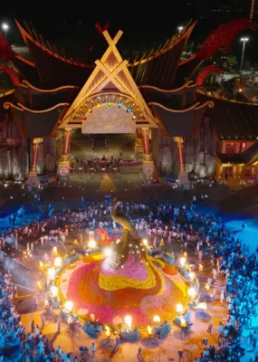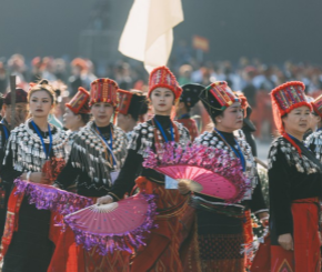 目瑙纵歌场上,上万人伴随着木鼓、铓锣、洞巴、笛子等乐器的节奏井然有序入场,人流如巨龙般蜿蜒环绕。