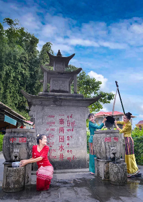 伴着阵阵鼓声,人们跳起欢乐的“嘎伴光”,男女老少间互相泼水,互祝吉祥、幸福、健康。现场,祝福的水花四处飞溅,到处洋溢着浓厚的节日气氛。